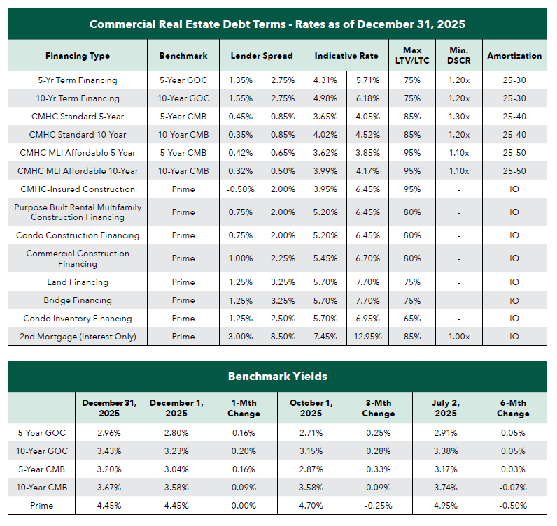 As 2025 comes to a close, we look back on a year marked by a continued shift in how lenders and borrowers approach risk. The market is more constructive than it was a year ago, but it is also more disciplined. As we look forward to 2026, we anticipate a year that is built on cautious optimism that the worst is over. Market sentiment is that 2026 is likely not a breakout year, but potentially one more of stability and limited recovery. The Canada U.S. divergence is likely to remain part of the backdrop, and as long as that is the case, borrowers should assume bond yields will stay capable of surprising them. Keep leverage sensible, build in cushion, and lock when the deal works.