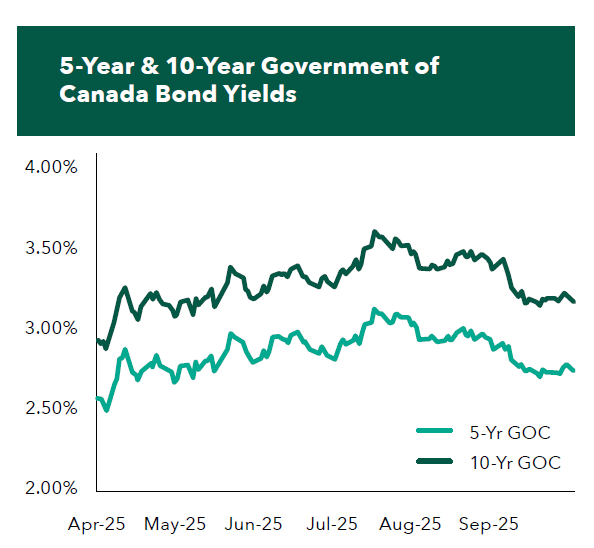 After a relatively quiet summer, Q3 ended with a surge of activity following Labour Day. On September 17, the Bank of Canada (“BOC”) cut the overnight rate for the first time this year, lowering it to 2.50%. The move was attributed to weaker job numbers and slowing economic growth, though the BOC remained notably reserved on whether further cuts are forthcoming. South of the border, while President Trump pushed for an aggressive 100-basis-point reduction, Federal Reserve Chair Jerome Powell opted for a more measured 25-basis-point cut. Powell also signaled the possibility of two additional cuts before year-end 2025 should employment data continue to soften. Remarkably, this marks one of the rare occasions in history where the Fed has eased policy while the Dow sits at record highs.